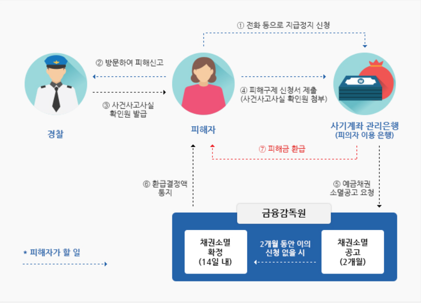 - 보이스피싱으로 인해 피해액을 송금한 경우 최대한 빠르게 해당 금융기관 또는 지역 경찰서로 연락해 지급정지와 같은 피해구제 신청을 해야 합니다.